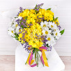 Сочетание белых и желтых  ромашковидных  хризантем, представленных в этом воздушном и очаровательном букете , выглядит  солнечно и свежо, а фиолетовый лимониум  и зелень рускуса подчеркивают  красоту  прекрасной композиции.
